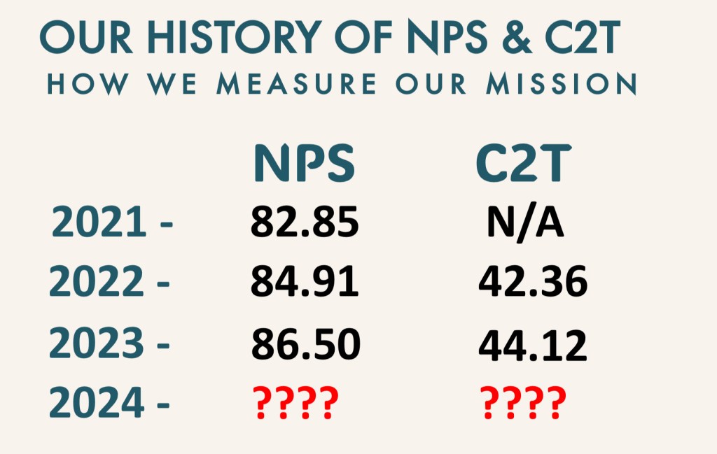 Ok, back out of the weeds! I’m simply wanting to emphasize that our mission sets such a high standard for people to feel compelled to tell others about their experience. And when we are increasing our influence with our promoters, we know we’re headed in the right direction, and establishing our reputation in the most believable way possible, by word of mouth. So this goes beyond just the Net Promoter Score, almost like adding the custard filling in a long john. Without the custard, it’s just another chocolate covered donut! Which is ok, I guess. But guess what? We are adding more and more filling this year. While we don’t know what the final number is going to be, we do know it’s tracking higher right now. Let’s finish the year strong, and we can all celebrate in the win! Oh, and a lot of you submitted numbers for our NPS & C2T scores back at the meeting. Below is a reminder of how we were tracking the last couple of years, and some of you are really close to where we might be ending up. A couple of you will be celebrating with $100 for being the closest, and the rest of us just might celebrate alongside you with some donuts!